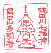 私たちと反対に上流から七福神詣でをするひと達も大勢いました。その人たちにとってはここ多聞寺が起点です。 もういちど、一緒に歩いてみるかって? もうそんな元気はありません。「あのう、駅へ近道はどう行くのですか」と訊ねるだけで精一杯でした。 ![]() 上りコースのゴールとなった多聞寺の毘沙門天スタンプです。 |