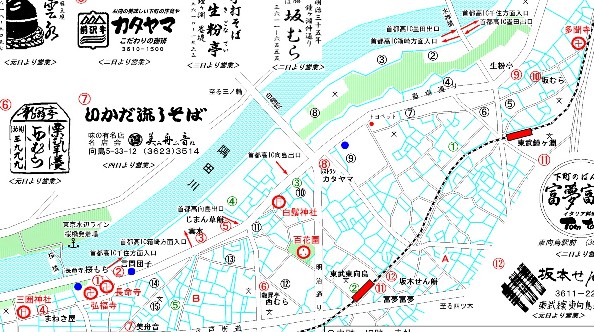 え〜明けましておめでとうございます。今年こそは何とかこの不景気を脱出したいと、日本の誰もが思うところですが、何か景気によいことはないだろうかと考えていたら、ありました。家にじいっとこもっていては経済には貢献できません。どこかへでかけましょう。それもなるがたけなら、気持ちの良いことで外出したい。そこで「七福神めぐり」です。なんだか唐突だと、思う方もいらっしゃるでしょうが、まんざらそうでもないのです。全国あちこちに七福神はあります。関東だけでも、あるいは都内だけでも大変な数の七福神があるようです。ある方の調査では都内に28箇所の七福神があるとのこと(興味のある方はYahooなどの検索で「七福神」↓とやってみてください)。中でも、「隅田川七福神」は老舗です。そこへ行ってみましょう。 実は、去年の11月下旬に仲間数名で向島散策をして百花園まで行っています。もっと昔10年以上前には鐘ヶ淵まで電車で行って梅若塚のある木母寺(もっぽじ)から水神様の墨田神社へ寄って白鬚(しらひげ)神社、百花園と逆コースで墨東の道を下ったこともあります。それぞれ目的があってのことですが、「七福神」を訪ねようと思い立ったのはこのお正月になってからです。思い立ったが吉日、新春3日の朝早くに吾妻橋のたもとに立ちました。 まずは地図が見たいですよね。間に合わせで済みませんが、「隅田川七福神」公式ホームページの地図を部分借用しました。 |