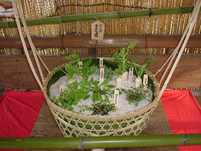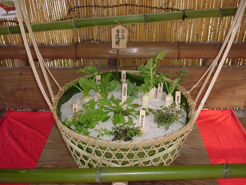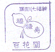 ところで、百花園では「春の七草」を頒布しています。 せり、なずな、ごぎょう、はこべら、ほとけのざ、すずな、すずしろ これが言わずと知れた春の七草ですが、左の写真はその看板とも言える 特大の寄せ植え篭です。いわば、「春の七草」の商品見本。一般売られているものは手に提げて持って帰れるものです。しみじみと春の七草をご覧になりたい方は左の写真をクリックしてください。 ![]() 向島百花園の福禄寿のスタンプです。 |
