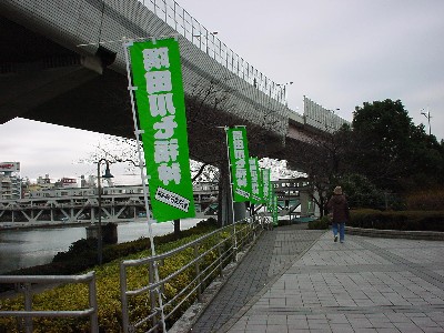 吾妻橋を渡ってビール会社直営のビアレストラン前を隅田川の上流に向って歩き出すと、この時期だけの案内標識、「隅田川七福神」の幟(のぼり)が、七福神めぐり初心者を親切に導いてくれます。 前の鉄橋を通っているのは東武伊勢崎線の電車です。帰りにはお世話になります。 歩き始めるとすぐ、江戸時代に水戸徳川家下屋敷のあった小梅の墨田公園が右に見えます。多くの方がテント生活をされていますので、迷惑にならないよう静かに歩くことをお勧めします。 |