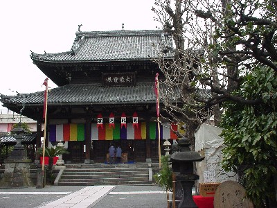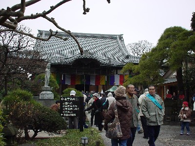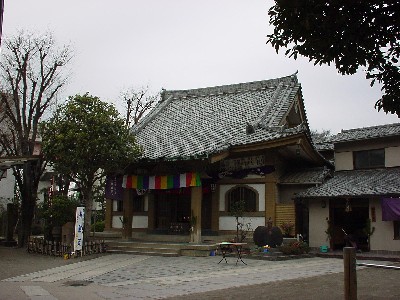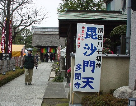 白鬚神社を後にして、隅田川七福神最後の毘沙門天を祀る多聞寺を目指す道のりは大変に難渋を極めました。朝からの雪空からとうとうチラついてきたからです。地図をご覧になると分かりますが、白鬚神社から多聞寺の間は七福神の中でいちばん離れているのです。 冷たい風が運ぶ雪がほおにあたって凍ります。しかし、ここで引き返すわけには行きません。ひたすら「隅田川七福神」の幟を辿って歩き続けました。 白鬚神社を出てから30分近く歩いた頃に藁葺き屋根の山門を持つ多聞寺の建物が見えてきました。吾妻橋にある東武浅草駅から、電車でいえば業平橋、曳舟、東向島、鐘ヶ淵の4駅の先にあるのが多聞寺ですから、相当歩いたことになりますが、心配しないでください。この辺の一駅は1Kmくらいの間隔になっているようです。 とにかく、多聞寺に着いたときはうれしかったです。 | ![]() |