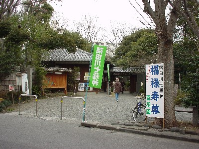 長命寺のさくら餅屋さんを後にして、隅田川七福神ののぼりをたよりにしながらも、途中でちょっと不安になるのが福禄寿を祀った「向島百花園」までの道のりです。 そもそもこの百花園が「隅田川七福神」発祥の地なのだそうですな。百花園の入り口には墨田区役所によるこんな説明が出ています。 『文化元年(1804年)向島百花園が開園してからここに集まる文人たちが、園主佐原鞠塢が福禄寿を祭っているのを知り、この隅田川の東岸にも七福神がそろわないものかと考え、七福神にそれぞれ縁故をもつ神社仏閣を捜し出した。そして初春七草の間に寿福を祝い、家門繁栄、宗家隆盛を願う初参りの行事をしたのが、隅田川七福神のはじまりである。七福神の七という数は、陽を表わす奇数であって、古くから、めでたい数字とされている。七難即滅、七福即生、万姓安楽という語句は七福神の語源ともいわれ、寿命、有福、人望、清廉、威光、愛敬、大量の七つの神々を象徴するもので、心新たな年頭にあたって参拝し、その年の至福を祈念するならわしが七福神初詣でのいわれである。』 どうです、たいしたものでしょう。 | ![]() |