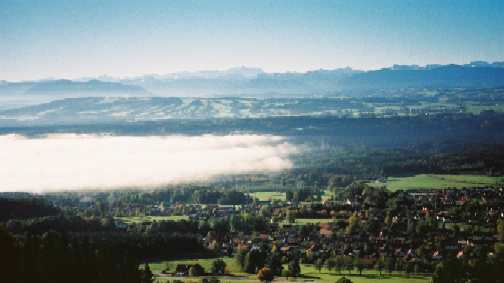 お願いしたのは「どこでもいいから南ドイツらしいところへ連れてってください」という主体性のない日本人らしい希望。よし、てんで案内してもらったところはどこをどう走ったのかそのときは良く分りませんでしたが、アウトバーンを180Kmくらいですっ飛ばしたり、山道に分け入ったり、国境を越えてオーストリーに入り込んだり、これが後でよく考えると大事なところをちゃんと見せてくれたのです。初めの写真を見てください。バイエルンの初冬特有な霧がたれこめた上にアルプスの峰々が見えています。