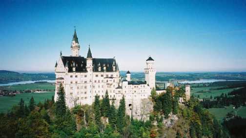 ところで、南ドイツの観光といえば定番はノイシュバンシュタイン城です。生意気にも、「そういうところで行列して時間を使うのはもったいないのでパスしていいです。遠くから眺められる程度で・・」などと、それでも少し未練げなことを言ったので、「そうしよう、そばを通るからそのとき見えるよ」と、そのつもりだったのですが、やっぱり気にはなるのですね。「どっちの方?」、「そろそろ、見えますか?」などとやっているうちに、向うもこのあたりを案内するのにあそこを素通りしては「案内をしたような気がしない」ということのようで、「ちょっとそばまで行ってみようか」ということになり、駐車場に車をとめて城山に上る小型バスに乗せてくれました。ついたところはマリエン・ブリュッケというつり橋の上、ここからの眺めはまさに絵葉書です。けれども、行かれたかたはご存知でしょうがあのマリエン橋という幅が2メートル足らずのつり橋の下は千丈の谷底がはるかに見えるし、大勢の人がその上を歩くのでゆれがひどい。つまり怖いのです。だから右の写真がすこしピントが甘いのではないかというご批判もあるでしょうが、写真の解像度圧縮のせいばかりでなく、手ぶれも加わっていることをご理解ください。この旅行中、命の危険を感じたのはこのときだけでした。