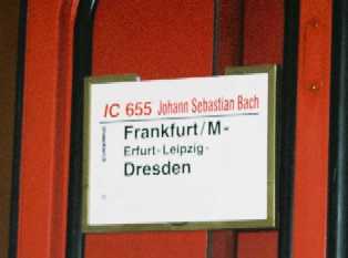 わかりますか。読めますよね。列車の名前が「Johann Sebastian Bach」号 Frankfurt/M発 Erfurt - Leipzig 経由 Dresden行。DB(ドイツ鉄道)の特急列車には昔の偉大な人物の名前が付けられているようです。そう言えば、ニュールンベルグへ行くときの列車にはリーメンシュナイダーという彫刻家の名前がついていました。ちなみにこの日、復路のICEは「Georg Philipp Tellemann」号、そうです。あのターフェルムジークを作曲したBachのよき理解者、テレマンでした。