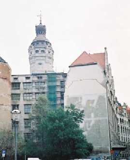 時間を見計らって、そおっと教会の中に入ってみました。正面の祭壇の床になにやら文字が書いてあるのを見つけて、近づいて読んでみると紛れもなき「バッハのお墓」です。どういう風に拝んでいいか、とっさには思い浮かばず、黙って黙祷をしてきました。バッハのお墓はもとは市内の別の教会墓地にあったようです。死後150年近く経って、1894年に聖トーマス教会の中に移したのだそうです。そのとき掘り出したバッハの遺骨の写真を本(「バッハ=魂のエヴァンゲリスト」礒山雅著、東京書籍)で見たことがあります。聖トーマス教会の中にも売店があり、別のCDがあったので買いました。ライプチッヒで買ったCDは都合5枚で、これは今もときどき聴いています。お墓参りがすめば、少し遅いお昼です。ドイツの知らない街で食事の場所に困ったら市役所を探す。これが鉄則と覚えていましたので、ライプチッヒの新市役所へ向かいました。右の写真が「新市役所」です。これも工事中。「新」ていうけどあまり新しくないじゃあないか、というお疑いもっともですが、これよりさらに古い「旧市役所」が別の場所にあるのです。ちゃんと見ました。市役所で食事のできるところは「ラーツ・ケラー」と呼ばれる市役所の地下食堂、大抵の街の市役所にはラーツケラーがあります、現にミュンヘンでもラーツケラーのお世話になりました。市役所の職員に尋ねたりして、地下への入口を入ると古いけど立派な食堂がありました。ここで弱ったのは、さすがにここまで来ると英語が通じないことでした。さっきのバッハ博物館までは大丈夫だったのですが、ほとんど地元の人を相手にしているのでしょう。初老のウェイターは愛想はよいのですが、英語で注文しようとすると、「わからない」というのです。出発前に少しドイツ語の単語をさらってきたのですが、ニュールンベルグの焼きソーセージ屋さん以来、油断したツケがまわってきました。、本日のランチは3種類あるので、できれば魚のほうにしたいと思っていろいろな言い方で注文したのですが、出てきたのはハンバーグです。何故か、ビールは注文通りのものがきました。まわりを見ると、市内のお年よりたちが仲間で誘い合ってお昼を食べに来ているらしく、なんとものどかな雰囲気でした。同じラーツケラーでもミュンヘンのウェイターはこれも初老でしたが、英語が達者で客扱いも慣れている印象を受けたものです。