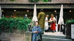 旧市内一周が終わるとちょうどお昼です。さあ、いよいよ「焼きソーセージ」です。「血のソーセージ」じゃないぞ、と少し緊張して、すでに市内一周のときに場所を確認しておいた本場の本店「ブラートヴルスト・ホイスレ」に急ぎます。下の写真のように店の前にもテーブルが出ていてそこで美味しそうに食べてるひともいます。つうっと店に入ろうとすると、体格の良い、少し怖そうなおばさんが、「待ちなさい!」というように手で制して「ジャーマン、オア、イングリッシュ?」訊いてきます。つまり、英語の方が通じやすい外国からの客とドイツ語でいけるグループを分けてサービスしているのですね。「英語!」と言って、数分待っていると、「はい。こっち空いたから、このテーブルに坐ってちょうだい」といったかどうか、今となっては良く覚えていないが、英語客のテーブルに空いた2つのイスに坐れたのでホッとしました。何故と言って英語グループならば「ベークト・ソーセージ」でOKの筈。「血」の恐怖からは解放されたわけです。ソーセージを注文するときは「6本」、「8本」、「10本」と数で量をいい、「マスタード」か「メアレティヒ(西洋わさび)」か調味料の好みを訊かれます。「焼きソーセージのマスタード10本、メアレティヒ6本、それから「ゆでソーセージ」10本もらおうかな。飲み物はビール」というような調子です。