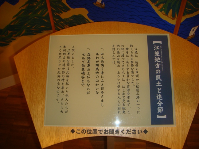 「傳馬通いの程の良さ」などという言葉はイナセな感じがして、いいですね。 CDに入っていた追分の文句の中で、特に気に入っているのが次の追分です。 (前唄) 荒い波風もとより覚悟 ヤンサノエ〜 乗り出す船は浮世丸 西か東か身は白波のネ ただよう海原はてもない (本唄) 櫓も櫂も波にとられて身は捨て小舟 どこにとりつく島もない (後唄) 波に千里のおもいをのせてネ 月に棹さす筏舟 いま気が付いたことがあります。前唄、後唄のそれぞれに有る “ネ” (身は白波のネ、おもいをのせてネ)が江差追分に独特の情趣を添えて、聴く者に豊かな余韻を与えてくれるようです。試しに“ヨ”だとか“ナ”に置き換えてみると、味わいの違いが歴然とします。これは私だけの感じ方でしょうか。 芸能は聴く人、見る人によって味わいは様々であると思いますが、先人の長い歩みの中で唄い継がれてきた「江差追分」には奥深い魅力を感じました。 あとがき: 仕事の出張とは別に、自分で出かける旅にはどこへ行くにしても何かしら目的がありますが、初めて訪ねる場所でそれが満たされることはそう多くありません。今回、以前から気にはなっていながらも行けなかった江差についても、交通の問題も含めて、まずは下見のつもりで出かけました。結果は上々吉!大いに満足して帰り、帰宅後ひと月余り、毎日追分のことを考えていました。これは自分のため記したとりあえずの備忘メモです。お世話になった「江差追分会館」の皆さまに感謝いたします。 平成22年7月31日 稲林記