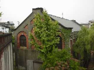 蹴上発電所の建物、うっそうとした木々に囲まれているが写真右端に導水管が見える。