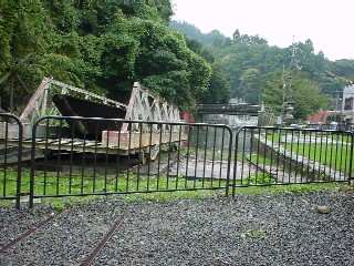 上の写真から後ろを振り返ると疎水の蹴上口、手前に見えるのは舟を載せる台車である。疎水の水は前方奥の左手に迂回して一部は水力発電の導水管に導かれ残りは南禅寺方向から市内へ向かう。