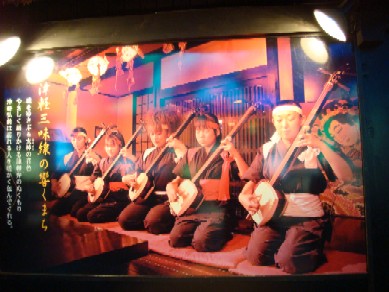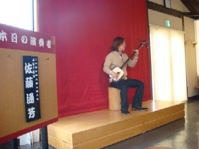 ここに写真を掲げられた三味線名人の名前とプロフィールの一部だけ記しておきます。 高橋竹山 明治43年〜平成10年(1910年〜1998年)ボサマ(門付け)として漂泊の旅を続け、遂に津軽三味線の名人と呼ばれるまでになった伝説の人。 白川軍八郎 明治42年〜昭和37年(1909年〜1962年)雨だれの音、吹雪の音、木の葉のそよぐ音を三味線に取り入れて津軽三味線曲弾きを初めて弾いた元祖である。 木田林松栄 明治44年〜昭和54年(1911年〜1979年)叩き三味線の代名詞のように言われるくらい豪快な奏法であった。唄い手がその気になるような気合いのこもった伴奏をした。 福士政勝 大正2年〜昭和44年(1913年〜1969年)白井軍八郎、木田林松栄とならんで三羽烏と称された。客に唄を十分に聴かせるために伴奏者に徹した、唄付けの名人。 山田千里 昭和6年〜平成16年(1931年〜2004年)海外にも名を知られた三味線奏者であると同時にプロデューサーとして「津軽三味線全国大会」などを通して数々の名演奏者を育てた。 梅田豊月 明治18年〜昭和27年(1886年〜1952年)生まれつき手足の指が極端に短く、太棹を握ることが出来ず、努力の末に克服した津軽最初の名人。後に浪曲の曲師に転向した。 山弦堂での三味線演奏は、30分ごとに行われます。この日の演奏者は佐藤通芳という若い人でした。私達は二回の演奏を聴くことが出来ました。 ![]() はじめに、「じょんがら節」の曲弾きを演奏してくれたのですが、次の回では「あいや節」の後、こちらのリクエストに応えて「じょんがら」の新節と新旧節の比較演奏を解説を交えて親切に聴かせて貰いました。