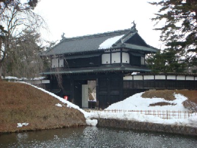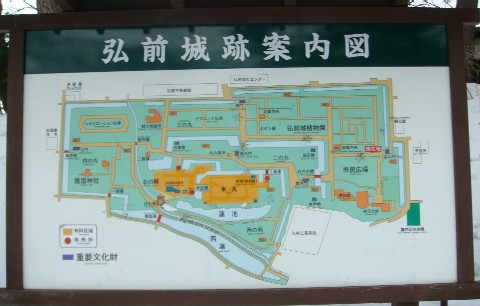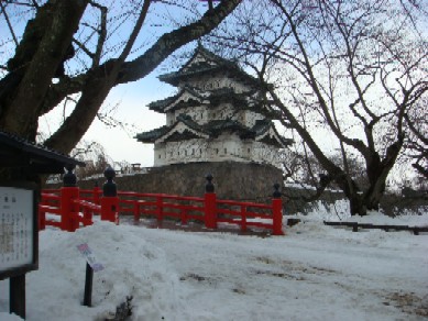 ![]() 初めに目についたのが、弘前昇天教会聖堂と書かれた案内板のある教会です。説明によるとこの地に宣教が開始されたのは、明治29年(1896年)で、この聖堂は大正10年に米国人の設計で地元の大工さんによって作られたそうです。 お城の北側を歩いていくと、今度は旧弘前市立図書館が建っています。 ![]() 旧弘前市立図書館は、洋風建築を積極的に取り入れた弘前の棟梁、堀江佐吉が施工し、明治39年(1906年)に当時の東奥義塾の敷地に建てられたものです。昭和の初めに払い下げになり、一時は移築されて下宿や喫茶店になっていたのを、平成2年に現在地に移築・復元されたそうです。この旧図書館の中を係りの方に案内してもらいましたが、ここで目についたのは地元弘前市内の出版社から出版された書物が展示されていることでした。 ![]() 旧弘前市立図書館のある一角には弘前市観光館もあり、弘前見物の予備知識を仕入れることができます。このころから、また降り出した雪の中を、お城に向かって歩きはじめました。 ![]() 案内図の右側にある追手門(上の写真)から城内に入って、天守閣のある本丸を目指します。 ![]() お城の中はかなりの雪が残っていて、そこへまた雪が降ってきて、ときどき吹雪く厳しい天候の中で、九州生まれの家内はしきりに戻りたがりますが、次の目的地へ行くのにはここを突っ切るしかないということを説明して、なんとか気を取り直させて、ひたすら天守を目指します。 ![]() ようようたどり着いた天守閣ですが、桜の頃の観光ポスターで見るのと違って、氷に閉ざされたお堀に囲まれた姿はまた一つの風情と言えそうです。ここは上の案内図のほぼ中央です。雪の中を滑らないように気をつけながら、入ってきたのとは反対側の北門を目指して雪中行進を続けます。八甲田山の彷徨がふと脳裡をかすめるころ、ようやく北門が見えてきてひと安心しました。 無理をしてお城を通り抜けたのは訳があります。案内図の左上の隅、お堀端にある「津軽藩ねぷた村」がこの日の目的地でした。 ![]() 津軽藩ねぷた村は津軽弘前のテーマパークといった趣ですが、ねぷたの展示、実演と並んで三味線の生演奏が聴ける山弦堂というミニステージがあることを聞いて、楽しみに入場しました。 山弦堂の入口には津軽三味線の説明が掲げられており、そのまわりには近年の三味線名人の写真とプロフィール紹介が分かりやすく展示されています。 ![]() この説明は津軽三味線の名手の一人であった山田千里氏によるものです。
