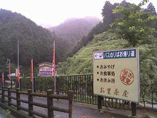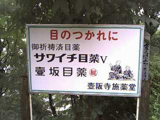 本堂を出て、そうそう、「お里・沢市の像があると聞いたが」と思いついて、側の売店(例の目薬やいろいろと有難い品々を置いてある)のおばさんに尋ねたら脇を指さして、「そこですよ」。なんだ、ちょいと小さくて分らなかったが、これがあるということは、二人が飛び込んだという幾千丈も知れぬ谷というはこの崖かなとみると親切に「お里・沢市投身の谷」という標識があって一目瞭然。覗いてみると、幾千丈はないかも知れないがそれでも、「お前降りてみるかい?」ときかれれば、「いやあ、わたしは切られ与三の連れの者です」「なんだい、それぁ?」「え〜、ですから、ご免『こうもり安』って」、「やな洒落だねえ」なんて、冗談はさておき、やっぱり飛び込みたくはない。
