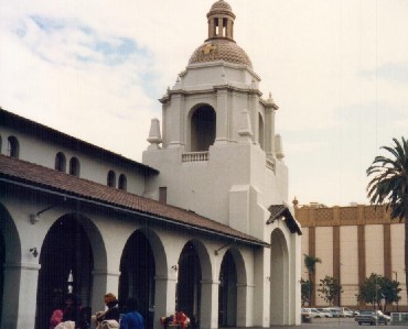 ロスアンゼルスに1泊した翌日は飛行機でカリフォルニア州の南端のSD(サンディエゴ)へ入る予定でした。そのままでもよかったのでしょうが、LAに到着した日にローカル航空のエアーカルが山の中に落っこちました。もともと、LAとSDの間は東京大阪間という距離です。なんだか、飛行機に乗るのが億劫になりました。ユニオンステーションのアムトラックに電話するとサンディエゴ行きの特急の座席があるというのですぐ予約して、急遽鉄道の旅に変更をしました。初日のホテル変更といい、2日目の鉄道への変更といい、ちょっと神経質なのではないかと思いますが、そのときは自分の判断に従っただけ。確かにひとり旅の始めは少し過敏になっていたのでしょうね。そのお陰で、快適なアメリカ第一夜を過ごし、地図の地形を思い出しながらカリフォルニアの海岸線を列車でたどりながら、距離感と方向感覚を確認しながらサンディエゴまでの旅を楽しむことができました。サンディエゴには同じ年の9月に行っていましたから初めてではありませんでしたが、前回はサンフランシスコから飛行機で往復したので、鉄道でのアプローチは新鮮でした。着いた駅はサンタフェステーションという南国らしい感じの駅舎です。全体にアメリカの大都市の駅はゆったりとしています。