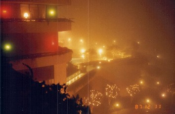 さて、金曜日までの講習を終えて、会社へ持って帰る「受講証明書」ももらって、あとはニューヨークから東部の訪問先への第2の旅が待っていました。その第1日目にあたる土曜日の朝、予定では早朝7:25のサンディエゴ発ニューヨーク行き直行のUA便にのるために4時起きして4時半頃ホテルをチェックアウトしたのですが、「今朝は濃霧で飛行機が飛ばないかもしれない」とフロントの人が言うので、「ちょっと、調べてよ」と頼みました。案の定、ニューヨーク行きは欠航でした。昼前になれば霧が晴れるというので、別の便に変更してもらって、9時過ぎにホテルを出れば大丈夫と、もう一度部屋に戻って寝ていました。そういえば夕べはやけに霧が出ていたなあと、そのときの写真があります。だいたい、サンディエゴ空港は一年中天候が良く、濃霧欠航などということはほとんどないのだそうです。よりによって、と嘆いても仕方ありません。ただ、ニューヨークへ遅く着くのは気になりました。