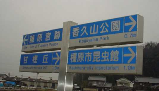 天香久山と麓の自動販売機 そして旅人を迷わせる案内標識