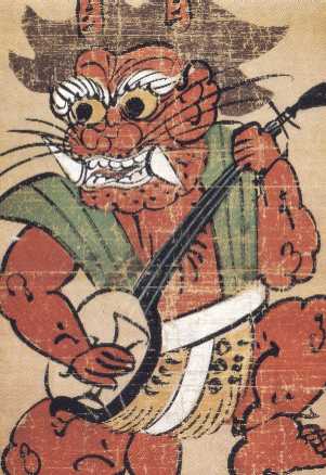 (このページの3枚の絵は古い大津絵で上から順に「長刀弁慶」、「鬼の三味線」、「藤娘」です:日本民藝館所蔵)