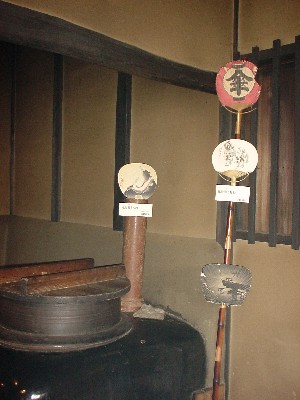![]() 坂東家の大きなかまどの脇には物怪柄のうちわ |