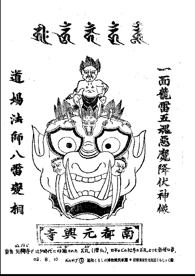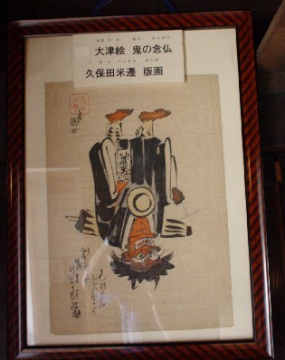 ![]() 大津絵の定番「鬼の念仏」逆さに掛けて福に返すとのこと。 胸に掛けているのは念仏鉦です。 |