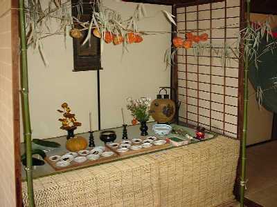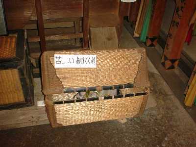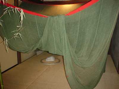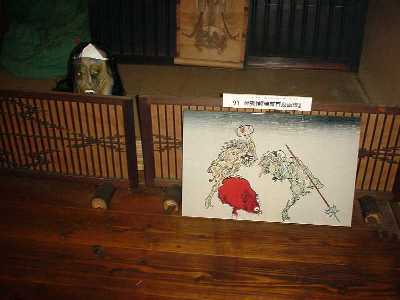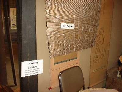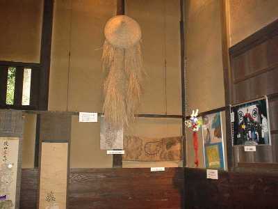 それでは、「物怪屋敷」へご案内しましょう。会場の「見沼くらしっく館」はさいたま市(旧大宮市)の片柳という地域、見沼田んぼの開墾に功績のあった坂東家の旧家屋がそのまま博物館になっています。駐車場からのアプローチで見えるくらしっく館の軒下にはレクチャーで聞いていた「七夕人形」が3体ぶら下がっています。どっしりとした屋敷全体にただよう怪しい気配にたじろぎながら、脇の土間に入ると、そこには霊が取り付きやすいという蓑笠がかかっています。まわりにはあやしげな掛け軸、人形、わけのわからない道具類。ここで悲鳴を上げるのは早すぎます。お腹にぐっと力をいれて奥に進みましょう。以下、写真を中心に当日お聞きした宮内先生の解説から注釈を書き込んでみました。