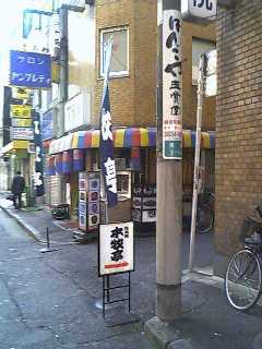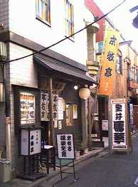 さて、冒頭にお約束した「池之端本牧亭」への道案内ですが、口で言うと「上野不忍池の野外音楽堂前の信号を渡って、池之端仲町通りを突っ切って直ぐの路地を右にはいったところ」です。野外音楽堂の信号を池を背にして渡ったところの角には「タンポポ」という喫茶店、池之端仲町通りにぶつかった手前左角には「堺屋酒店」があります。このへんまでくると定席の行われている日には右の写真のように路地の入口にのぼりが立っているのが見えるはずです。(住所は文京区湯島3−43−10 TEL: 03−3833−6138)