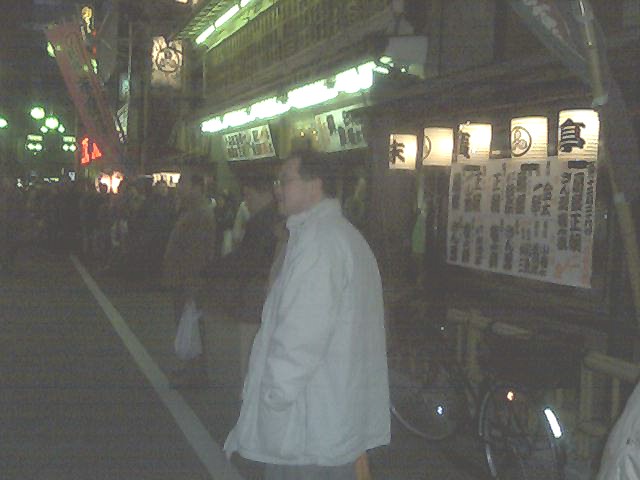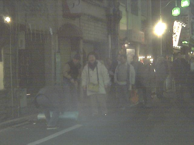 どうして、こんなに人気があるのでしょうか。さん喬、権太楼の両師匠が実力派の中堅であることは間違いありませんが、それだけではなく、お客さんを集めて大いに喜ばせる努力をしているのです。この日も、私たちが末広亭に着いたとき、前の道端で権太楼の一門の弟子達がカレンダーと林檎を売っています。さくらの客の趣向であれこれ尋ねているのが権太楼師本人でした。出店を片付けに掛かったところのスナップをデジカメで撮ったときに権太楼師と目が合ってしまいました。上の写真がそれです。フラッシュが弱くて分かりにくいのですが、真中のバッグを首から掛けているのが権太楼師でした。